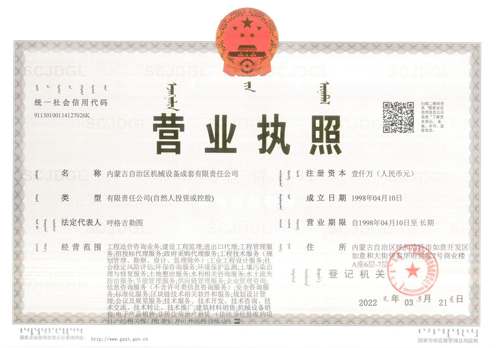 內蒙古自治區機械設備成套有限責任公司營業執(zhí)照